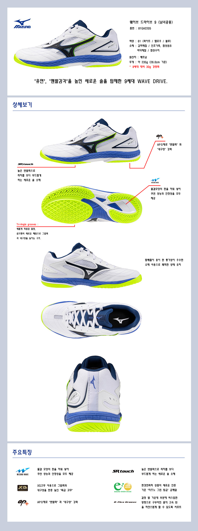 미즈노 - 웨이브 드라이브 9 탁구화 남녀공용 81GA220561 화이트옐로우블루